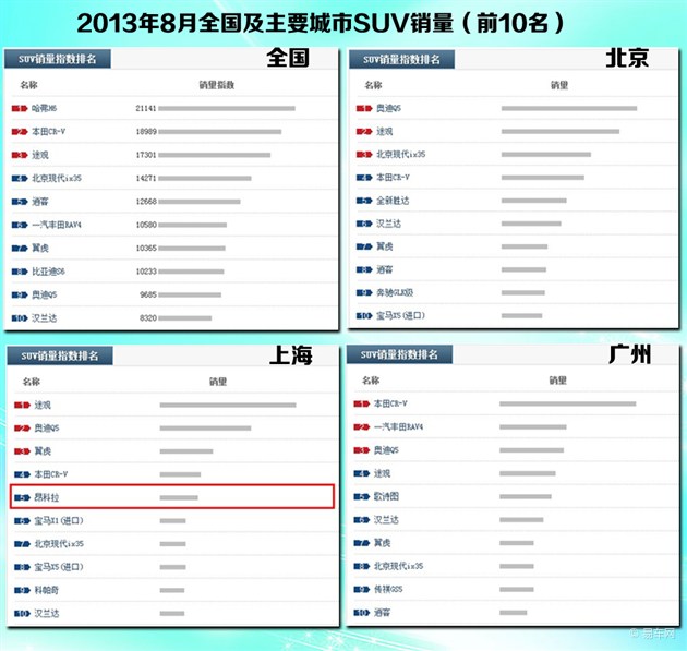 從全國和一線城市來看,SUV車型在銷量分布上只有上海有昂科拉榜上有名,北京和廣州則依然是A級和B級SUV的天下。