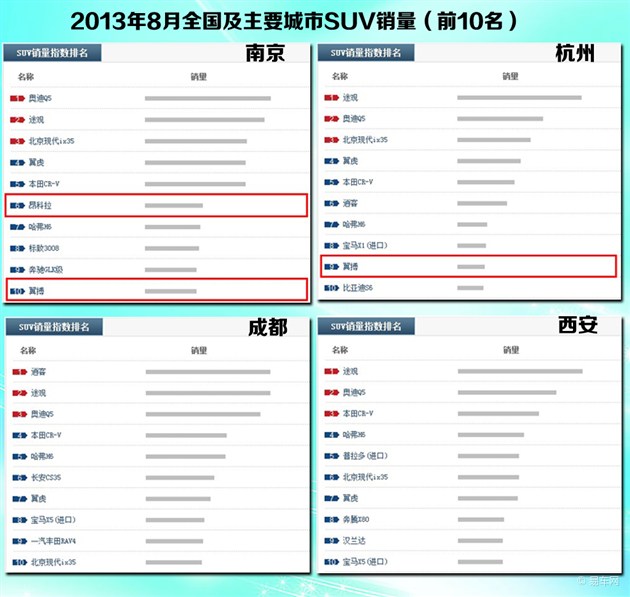 我們又選取了四個主要二線城市的情況,其中隸屬華東的南京和杭州也均有A0級SUV車型沖進銷量前十,而西部的成都和西安則無一上榜。