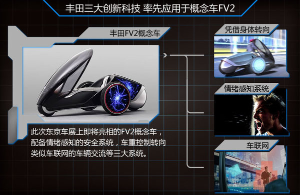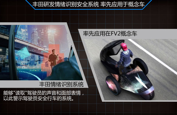 這三大創新系統將率先應用在豐田所研發的新型交通工具FV2四輪概念車上。其中值得一提的是,極具前瞻性的情緒識別系統可通過語音和圖像識別技術,檢測駕駛員即時的面部表情,通過擋風玻璃上的顯示屏,針對你的心情進行顏色變化。同時FV2概念車的擋風玻璃也可顯示路況和安全等信息。