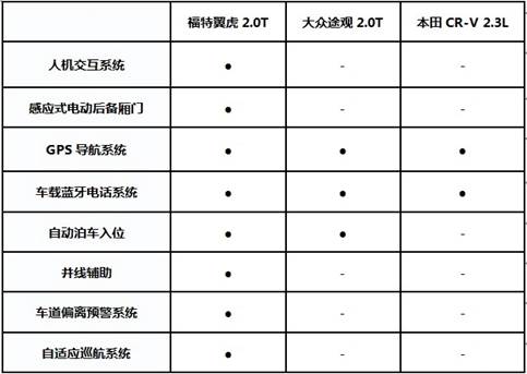 通過上表,我們可以看出在智能科技應用上,福特翼虎同樣領先。除了gps導航系統、車載藍牙電話系統為三款車型均配備外,自動泊車入位這項配置只有福特翼虎和大眾途觀有配備,人機交互系統、感應式電動后備廂門、并線輔助系統、車道偏離預警系統、自適應巡航系統等只有福特翼虎有配備,可以說完勝同級競品。