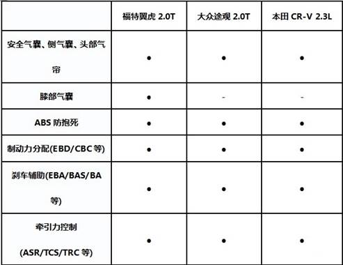 通過圖表我們能夠清晰的看出,無論是制動力分配系統、剎車輔助系統,還是牽引力控制系統、車身穩定系統,福特翼虎、大眾途觀、本田cr-v都有配備。