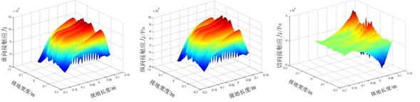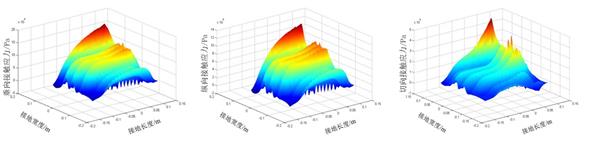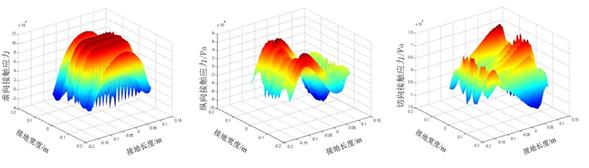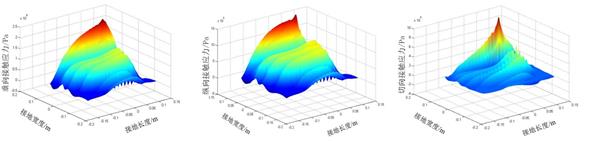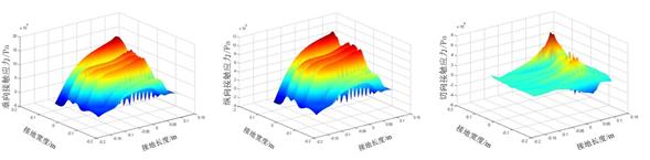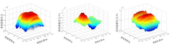 對于實(shí)際輪胎的使用工況而言,其通常具有外傾加側(cè)偏角的復(fù)合工況,圖13就為外傾加側(cè)偏時(shí)的復(fù)合工況輪胎制動(dòng)時(shí)的接地應(yīng)力分布示意圖。由圖13可知,外傾加側(cè)偏角的復(fù)合工況下輪胎制動(dòng)時(shí)接地應(yīng)力分布雖然可以看做是外傾和側(cè)偏兩種工況的共同作用結(jié)果,但是在復(fù)合工況下輪胎制動(dòng)時(shí)接地應(yīng)力分布特征主要體現(xiàn)出了單一側(cè)偏角存在的接地應(yīng)力分布特征,胎肩一側(cè)的接地應(yīng)力值顯著大于接地中心區(qū)域的壓力值。相對單一外傾和側(cè)偏工況所不同的是,,復(fù)合工況下三個(gè)方向上的接地應(yīng)力更為顯著的向胎側(cè)一端移動(dòng),胎肩處接地應(yīng)力值與接地中心區(qū)域應(yīng)力值差值變得更大。