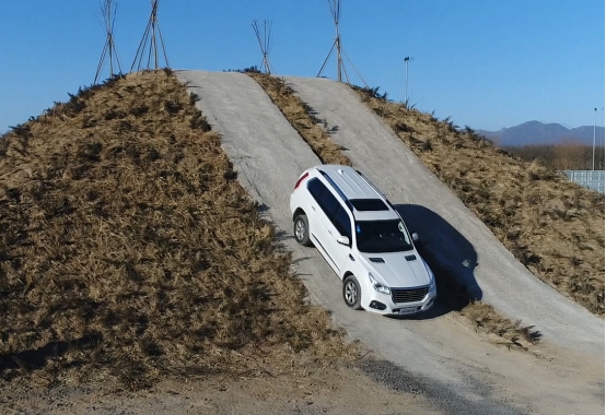 駝峰路的顛簸曾經讓小編頭痛不已,但是駕駛著H9小編并不是很擔心,這個考驗的是車輛的離去角以及接近角。哈弗H9的接近角是28°,離去角是23°,最小離地間隙206mm,而且有較長的懸架行程,在經過駝峰頂端的時候,離地間隙足夠,不會產生托底現象。動力儲備也夠,所以小編一路通過毫不費力。
